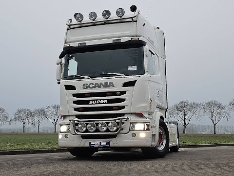 Number of axles: 2, Configuration: 4x2, Own weight: 8042 kg, Gross vehicle weight: 20500 kg, Total fuel capacity: 750 litre, Fifth wheel height: 120 cm, fifth-wheel: Fixed, Diff. locks: 1, Aluminium rims, Suspension type: air suspension, Cabin type: Topline, Cruise control, Tacho, Digital tachograph, Airconditioning, Parking heater, Electric windows, Electric mirrors, Radio/cassette, GPS navigation, Color: white, Heated mirrors, Lighting type: Halogen lamps, Laneassist, Climatecontrol, Seat heating, Bluetooth, Engine capacity: 331 Kw (444 Hp), Fuel type: diesel, Euro: 6, Gearbox kind: Opti-cruise, Gearbox make: Scania, Number of Gears: 12, Add. break system, Retarder make: Scania, Power steering, ABS, ASR, Hydraulic installation, PTO, PTO type: 1, Starter battery, Pump, Central locking, Seats configuration: 1+1, Seat cover: leather, Chair adjustment: Manually, Toplkine,durabright,hydr unit
